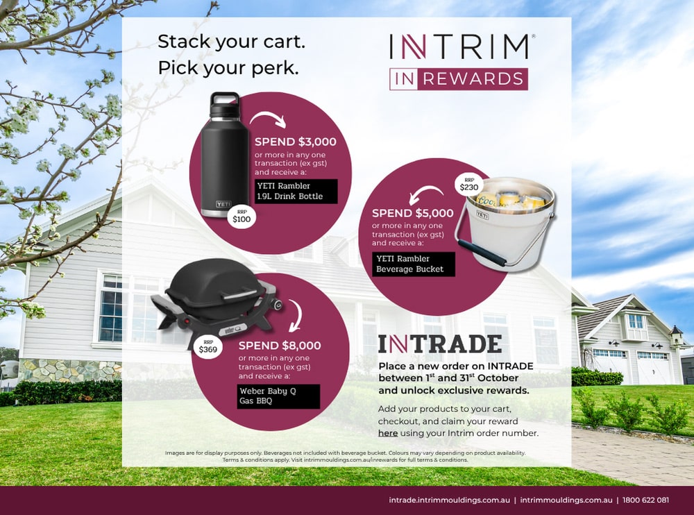 INRewards Stack your cart. Pick your perk. Place a new order on INTRADE between 1st and 31st October and unlock exclusive rewards with Intrim INRewards. Simply place your order online, checkout, and claim your reward here using your Intrim order number. 1 reward per order, max. 5 claims per company, account, or customer. While stocks last. Terms & Conditions Entry into this Promotion is deemed to be an acceptance of these Terms & Conditions. Open to approved INTRADE trade account holders only, placing orders via INTRADE only. Entry is only open to permanent residents of Australia. Where an entrant is under the age of 18, a parent or guardian must provide written permission for the entrant to participate. Promotion commences at 12.00pm (AEST) on 1st October 2025 and closes at 5.00pm (AEDT) on 31st October 2025, or once the first 50 qualifying orders are redeemed, whichever comes first. Applicable to new orders only, placed on INTRADE between 12.00pm (AEST) on 1st October 2025 and 11.59pm (AEDT) on 31st October 2025. Orders outside of these dates will be ineligible. Offer: One (1) reward per eligible order when order subtotal (ex GST) meets or exceeds: $3,000 (YETI 1.9L drink bottle valued at RPP $100) / $5,000 (YETI Rambler Beverage Bucket valued at RRP $230) / $8,000 (Weber Baby Q [Q1000N] Gas BBQ valued at RRP $369). Reward values are in Australian dollars and correct at time of publication. Intrim Group Pty Ltd accepts no responsibility for any variation in the value of the reward after that date. Note – colours may vary depending on product availability. Redemption: Reward can only be redeemed online through the completion of the entry form and must include the Intrim order number, contact details, and delivery address. Maximum of 5 order redemptions per company, account, or customer. All redemptions must be received no later than 5.00pm (AEDT) on 7th November 2025. Account customers must be within their agreed trading terms with Intrim Group Pty Ltd to be eligible to receive their reward. Your account status will be checked prior to dispatch. Limits: One gift per order. Not transferable, exchangeable, or redeemable for cash/credit. Stock: Rewards while stocks last. Intrim Group Pty Ltd reserves the right to substitute a comparable reward of equal value should a reward becomes unavailable. Rewards will be dispatched after the promotional period. Returns/Cancellations: If a qualifying order is fully/partially returned or cancelled so that it no longer meets the threshold, the reward must be returned (unused) or its RRP may be charged. In the event of a dispute Intrim Group Pty Ltd’s decision is final and binding, and no further correspondence will be entered into. General: Intrim Group Pty Ltd may vary, suspend, or cancel the promotion in unforeseen circumstances. Compliance: This is a gift with purchase and trade promotion permits are not required in this instance. Employees and their immediate families of Intrim Group Pty Ltd and their agencies and companies associated with the Promotion are ineligible to enter. Nothing in these Terms and Conditions limits excludes or modifies or purports to limit, exclude or modify the statutory consumer guarantees as provided under the Competition and Consumer Act 2010 (Cth), as well as any other implied warranties under the Australian Securities and Investments Commission Act 2001(Cth) or similar consumer protection laws in the States and Territories of Australia (“Non-Excludable Guarantees”). Except for any liability that cannot by law be excluded, including the Non Excludable Guarantees, Intrim Group Pty Ltd (including their respective officers, affiliated companies, employees and agents) excludes all liability for any personal injury, illness or death of any person; or any loss or damage (including loss of opportunity); whether direct, indirect, special or consequential, arising in any way out of the Promotion, including to the fullest extent permitted by law, due to Intrim’s negligence. In consideration of the acceptance of the entrant’s entry, to the fullest extent permitted by law, the entrant releases and forever discharges Intrim Group Pty Limited from all claims that the entrant may have or may have had but for this release arising from or in connection with any entrant’s participation in this Promotion and a winner’s acceptance and use of the reward. Any tax liability arising as a result of accepting any reward is the responsibility of the winner. If for any reason this Promotion is not capable of running as planned, the Promoter reserves the right in its discretion to modify the terms of the Promotion including the rewards and these Terms and Conditions where relevant. If any act or omission, event or circumstances occurs which is beyond the reasonable control of the Promoter which prevents the Promoter from complying with these conditions of entry, the Promoter will not be liable for any failure to perform or delay in performing its obligations and the Promoter reserves the right (subject to any applicable law) to cancel, terminate, modify or suspend the Promotion. The Promotion commences on 1/10/2025 at 12:00am (AEST) and entries close 19/12/2025 at 5:00pm AEDT. All entries are deemed to be received at the time of payment of an invoice being received by Intrim Group Pty Limited, and not at the time of transmission of payment by an entrant. By entering this Promotion, each entrant is taken to consent to the Promoter using the entrant’s personal information to administer the Promotion. The Promoter is bound by the Australian Privacy Principles in the Privacy Act 1988 (Cth) and by entering into this Promotion, each entrant also consents to the Promoter using their personal information for future marketing purposes of the Promoter. By entering this Promotion, each entrant is taken to consent to Intrim Group Pty Ltd collecting the entrant’s personal information (“PI”). Intrim collects personal information in order t
