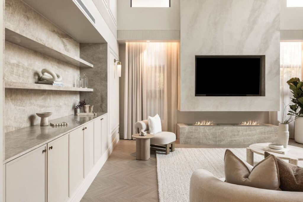 The living spaces showcase the power of thoughtful detailing to elevate design. Intrimโ€™s SK557 skirting runs throughout the residence, anchoring each room and providing visual continuity across the open-plan layout. The result is a seamless flow from one space to the next, where clean lines are grounded by subtle yet impactful finishes.